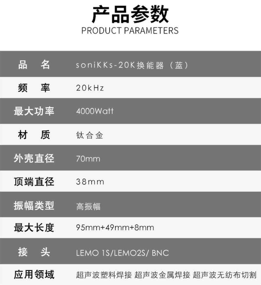 主要有超声波变幅杆材质,表面处理方式,形状。超声波换能器与超声波变幅杆连接螺纹,超声波变幅杆与超声波模具连接螺纹,超声波变幅杆法兰盘处直径、厚度、缺口或螺孔数量和位置。